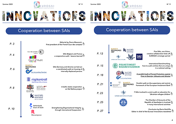 EUROSAI Innovations is the newsletter dedicated to innovative audit approaches, new ways of engaging with stakeholders or new management concepts. It is published by the Project Group "Innovations in EUROSAI", led by the French Cour des comptes, and is part of EUROSAI's strategic goal 1 (SG1).